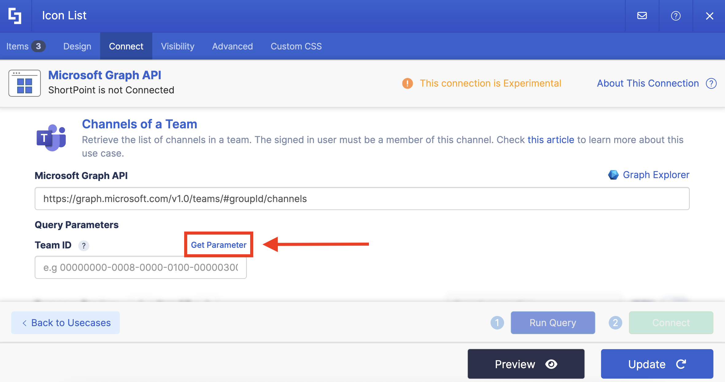 - Select the Use Case that best matches your desired results. For this guide, we'll use Channels of a Team, which will pull all the channels of a specific team.