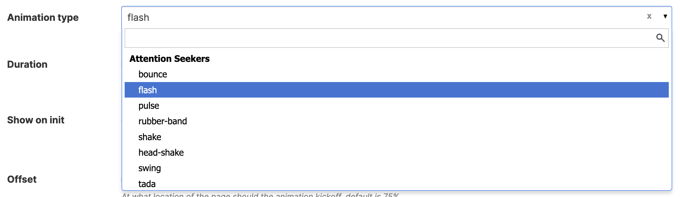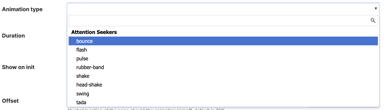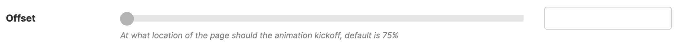 ![]() | Offset | allows you to set the position on the page where the animation triggers. The default value is 75%. |