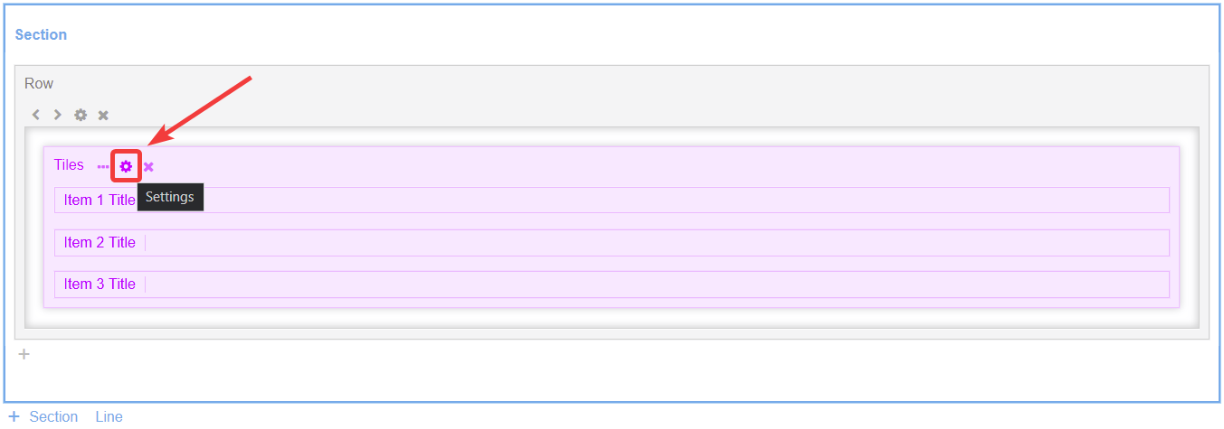 Click the cog wheel icon to open the settings of the Tiles Design Element: