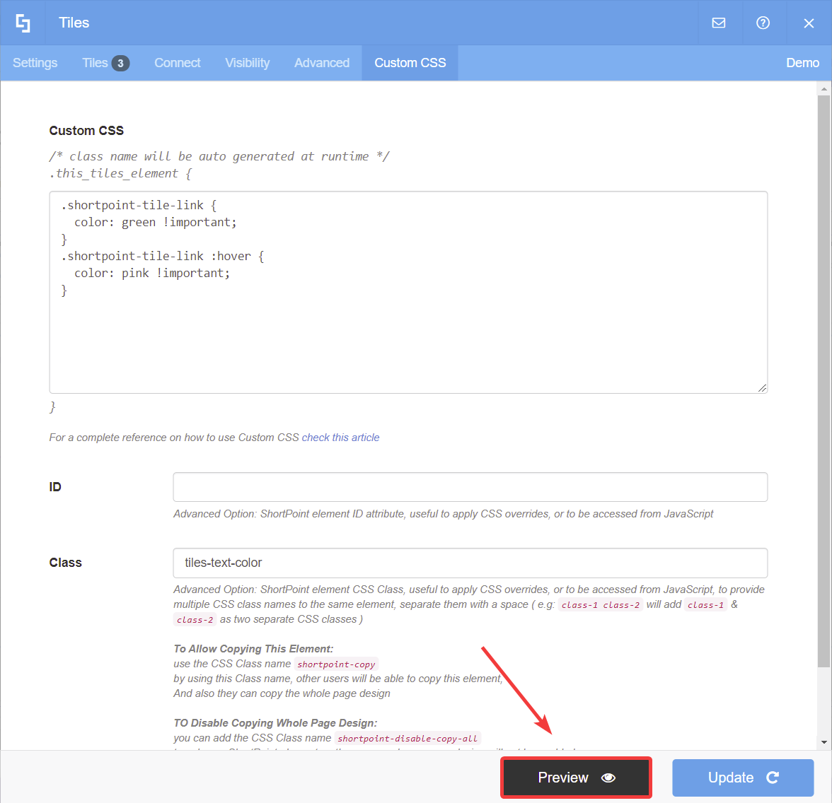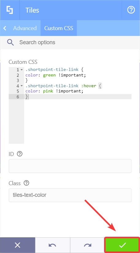 In the example above, we simply used the CSS to keep the text white. However, you will be able to assign both the link text and link hover colors separately. Follow the steps below to apply the custom CSS to your Tiles Design Element.