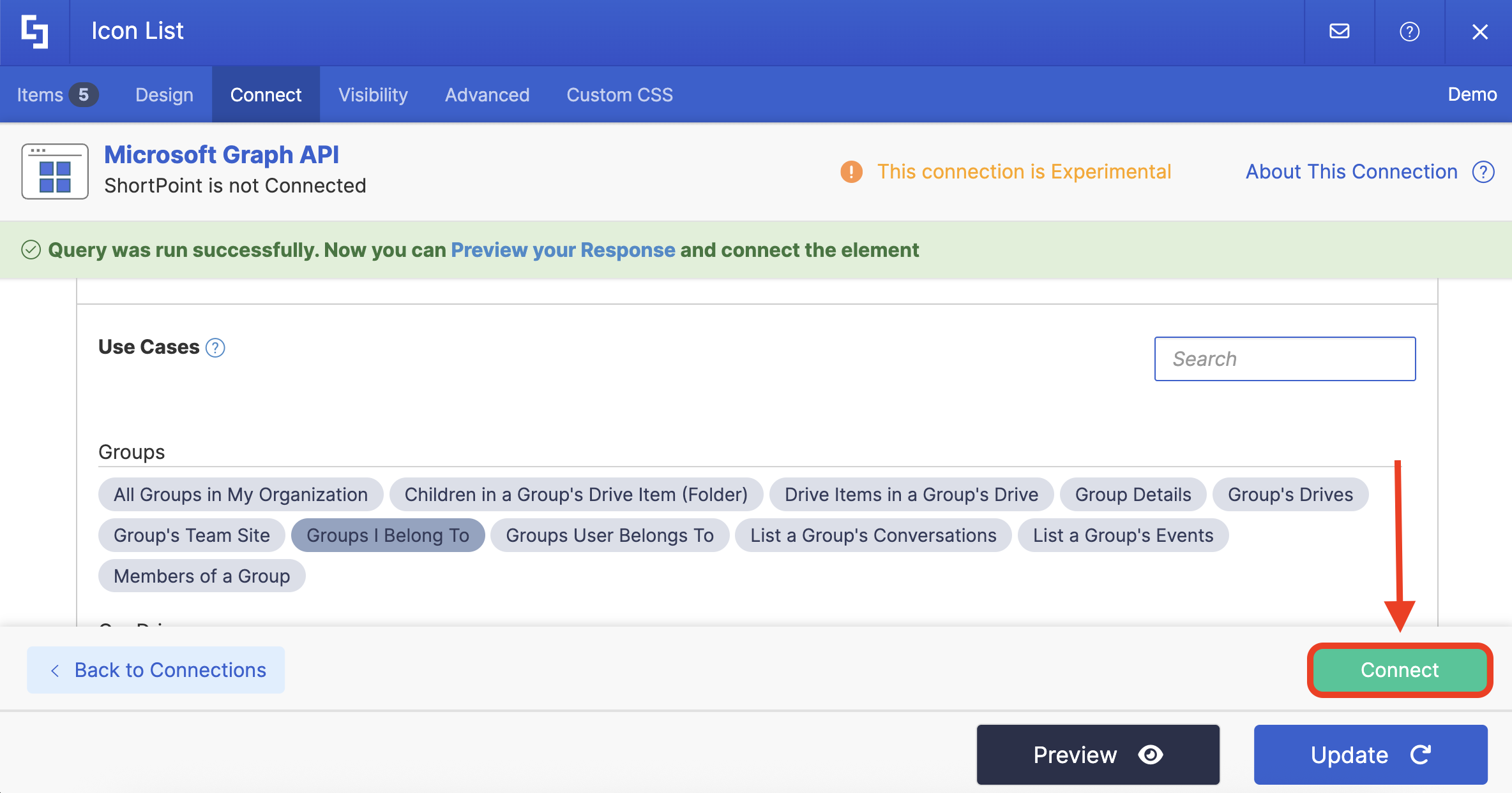 - You must have the Design Element you want to use to connect on your SharePoint page. For best results, we recommend using Design Elements that allow listing of multiple items (e.g. Icon List, Image List, Simple List, etc.).