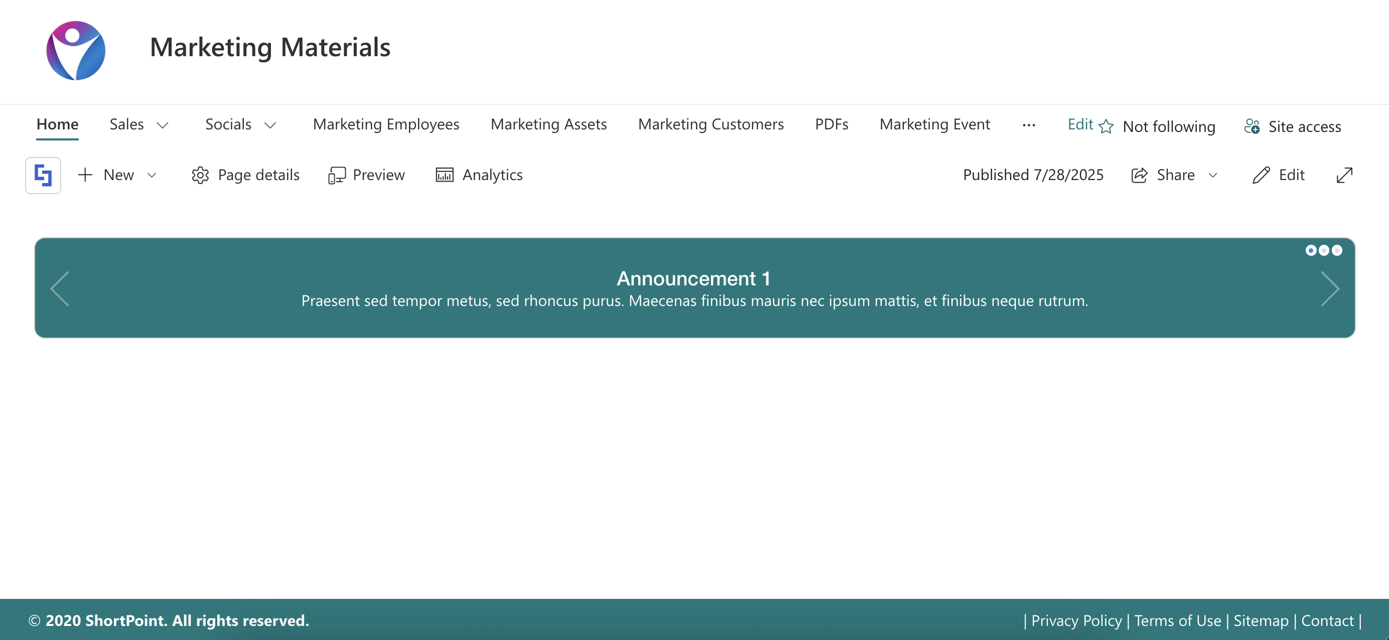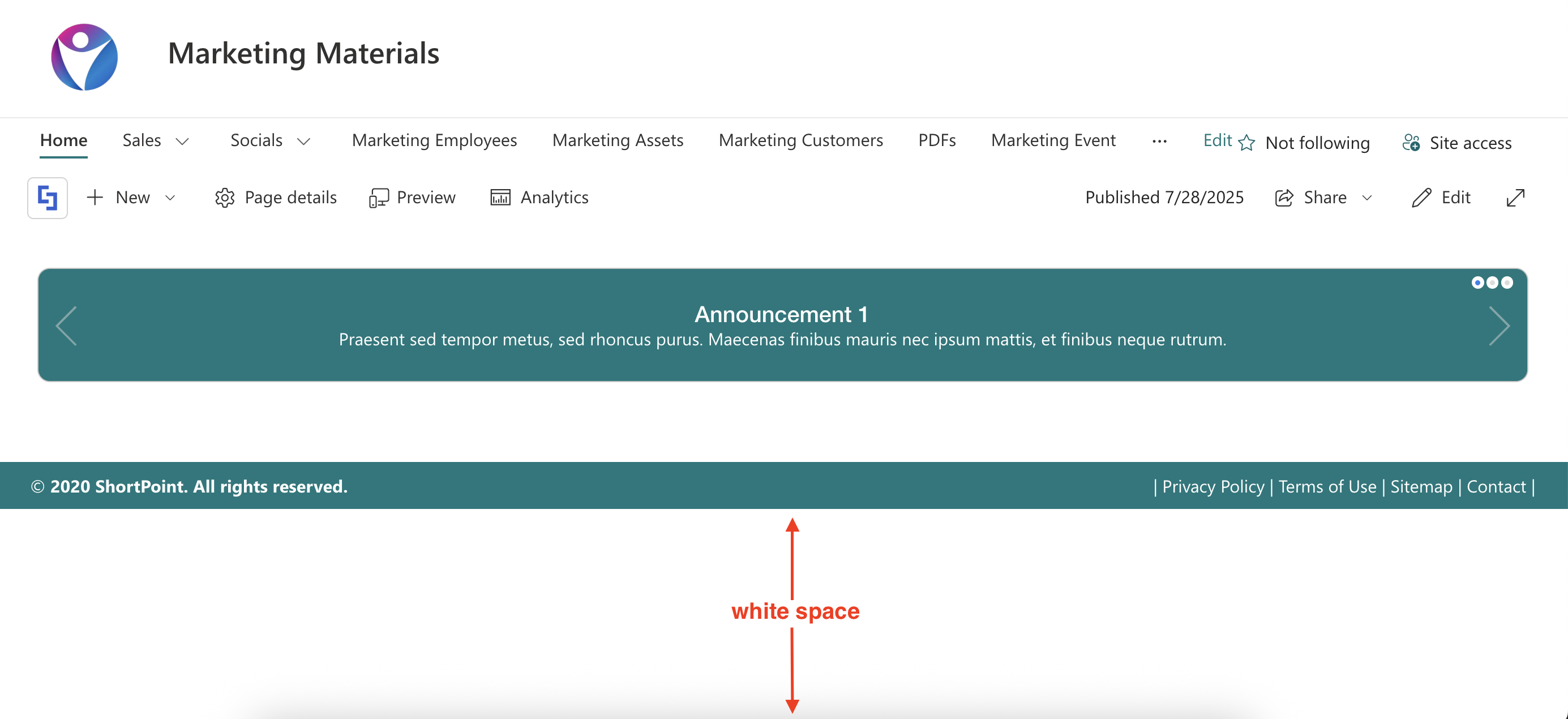 SharePoint pages with minimal content, like the one below, will display the ShortPoint footer in the middle of the page rather than at the bottom: