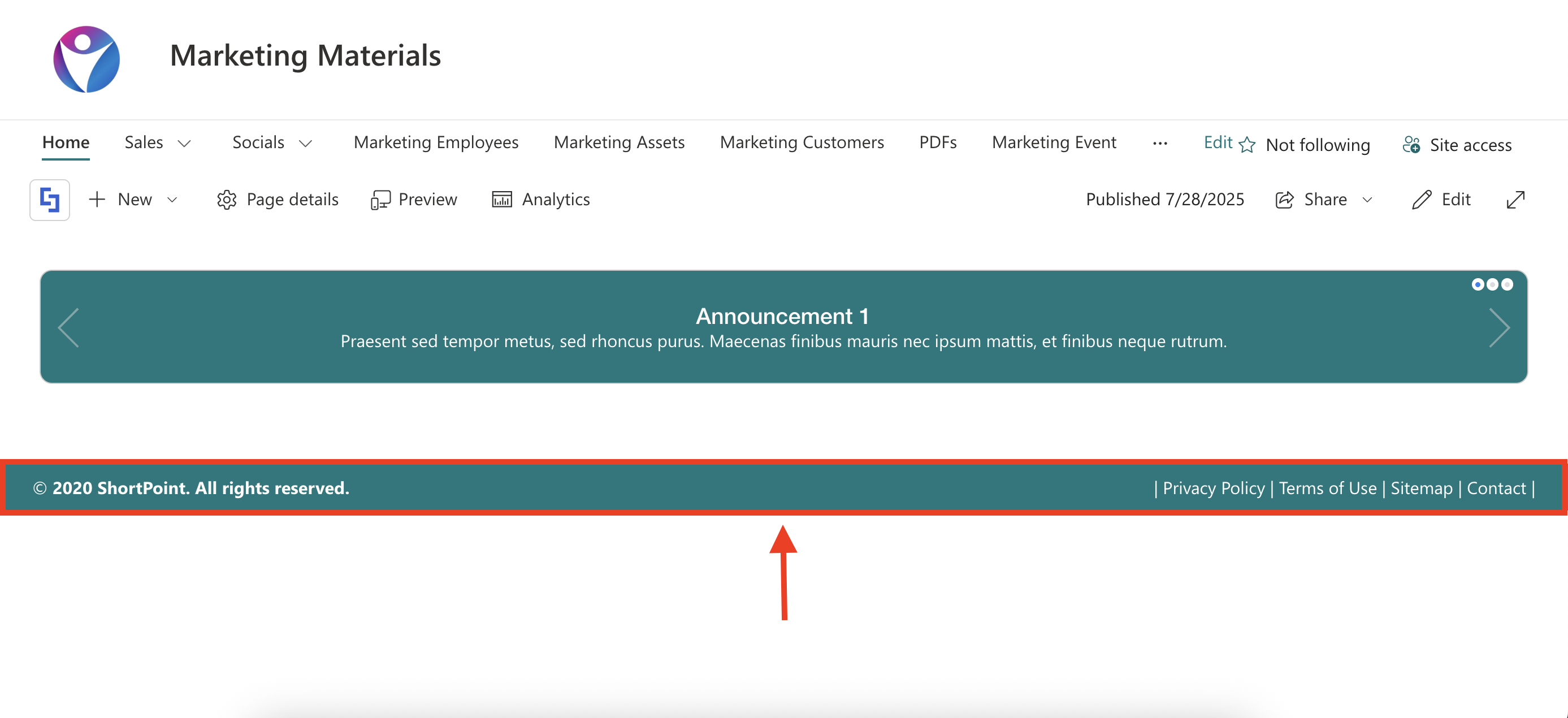 Congratulations! Your ShortPoint footer is now fixed at the bottom of the page: